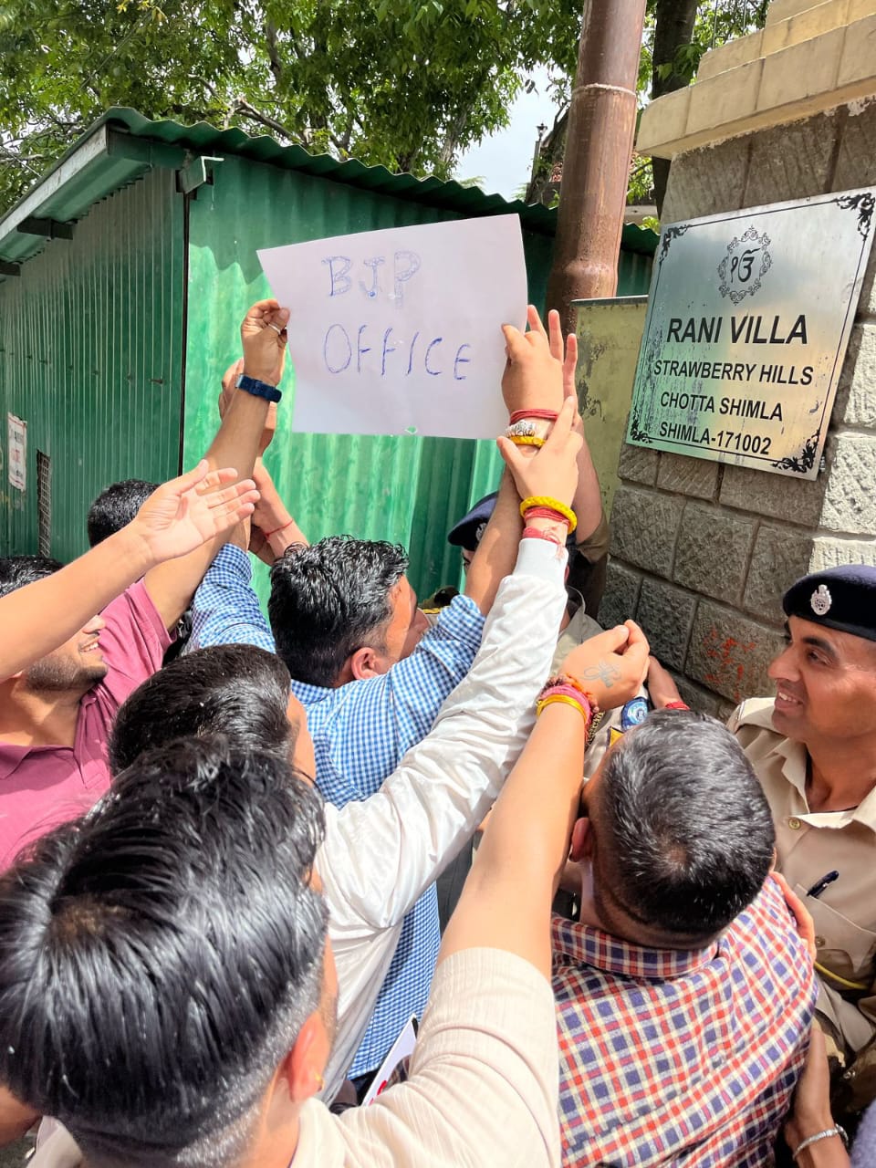 युथ कांग्रेस ने प्रवर्तन निदेशालय के गेट पर लगाया भाजपा कार्यालय का बैनर।